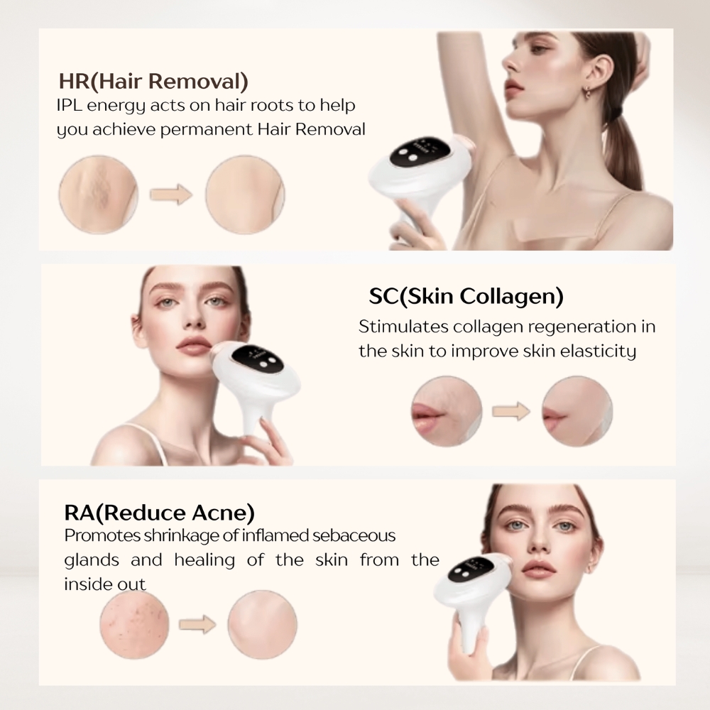 - VERSATILE ATTACHMENTS: Includes specialized heads for different body areas (RA, SC, HR) to target various treatment zones effectively. Adjust the heads with 9 different energy settings to suit your skin type and hair thickness. Whether you have fine or coarse hair, you can personalize each session for optimal effectiveness and safety.